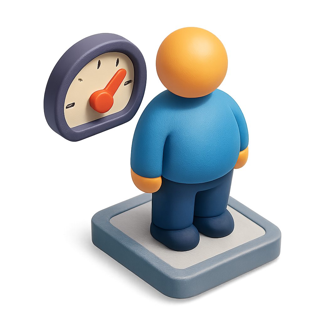 This image features a stylized 3D icon representing body mass, with a rounded figure in blue attire and an orange head. A clock is positioned nearby, enhancing the design.