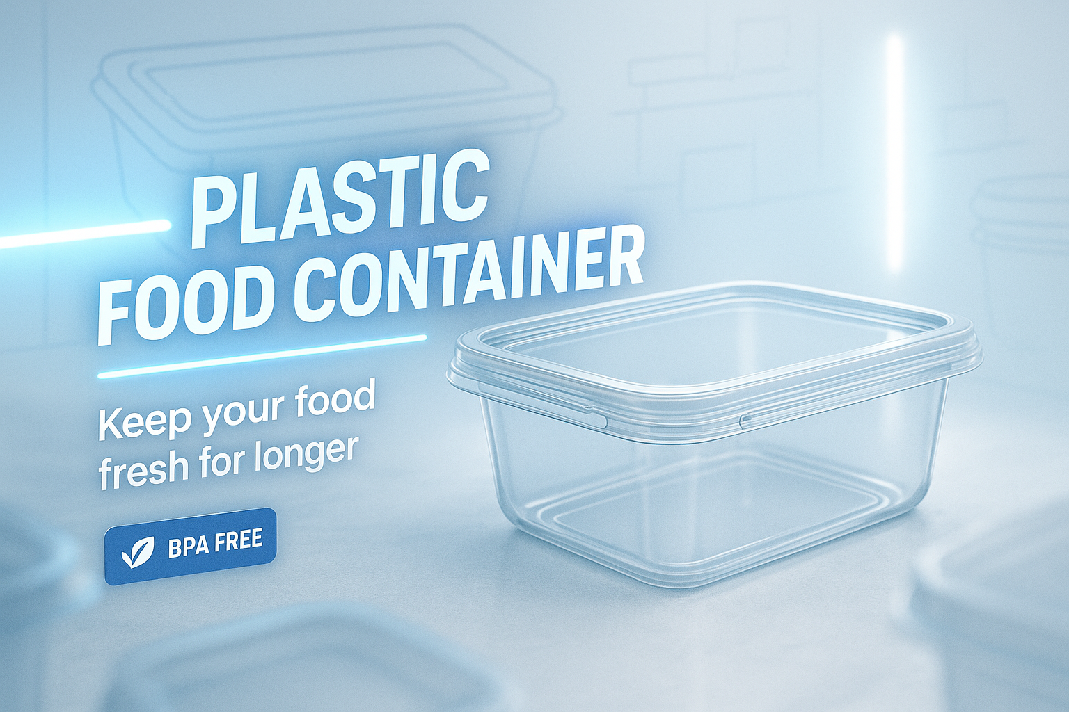 Sleek promotional graphic showcasing a transparent plastic food container, emphasizing its BPA-free feature with a clean, modern design. Ideal for product marketing.