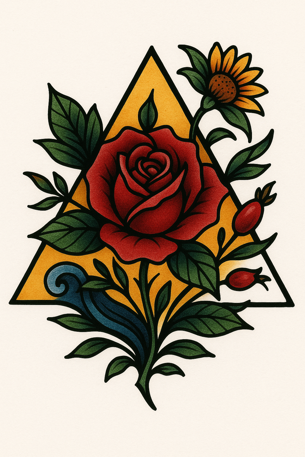Vibrant tattoo design featuring a rose and sunflower within a geometric triangle, ideal for body art enthusiasts and tattoo artists.