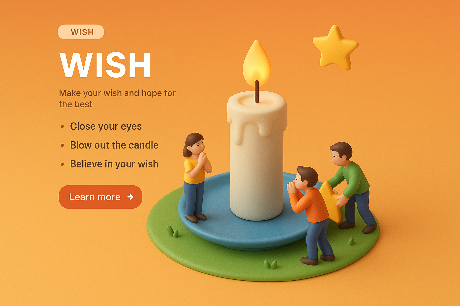 /Collection: /by davooda/Type: PNG/A vibrant 3D illustration depicting a wish theme with a candle, characters making wishes, and engaging elements. The scene is zoomed out to capture the overall atmosphere.