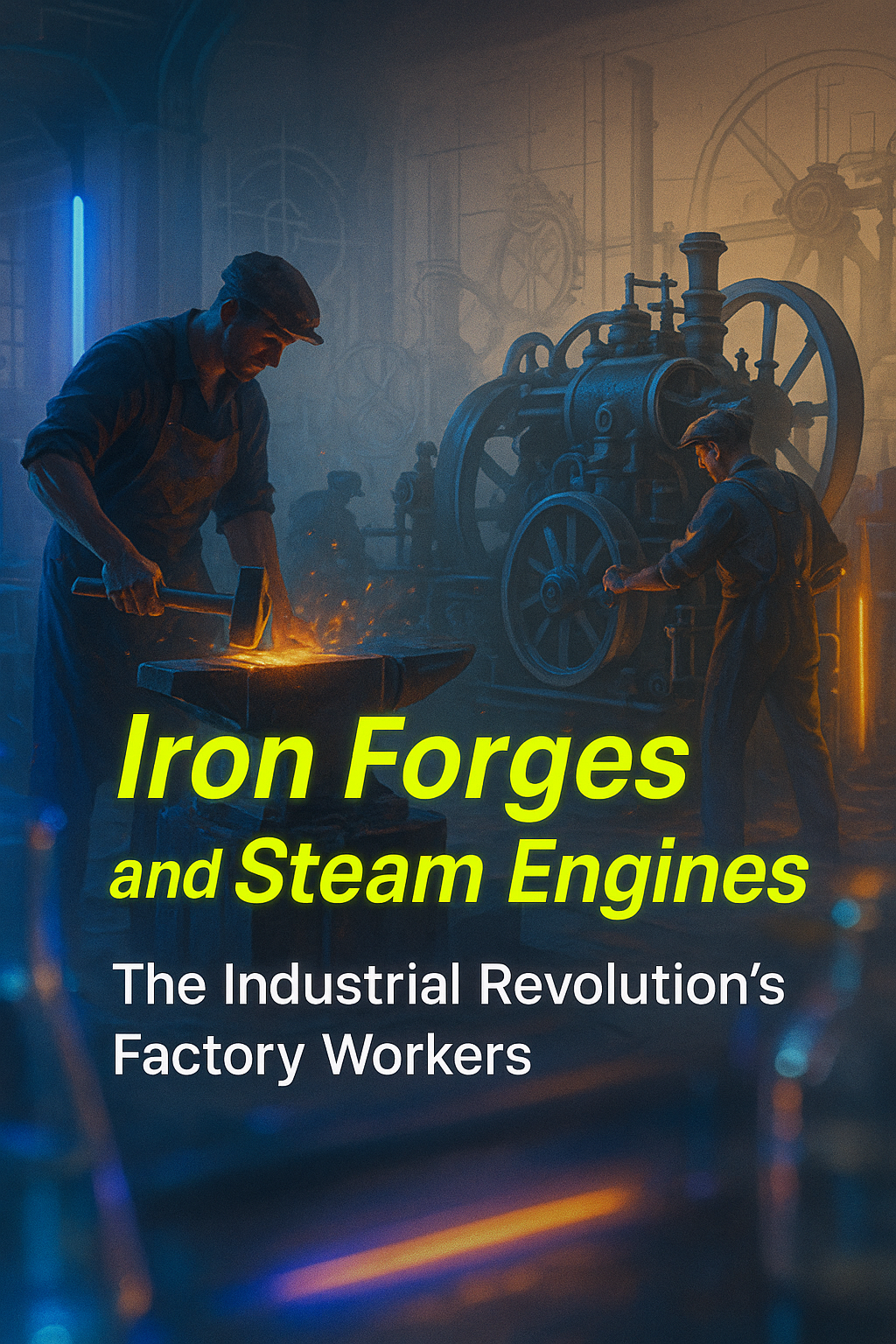 /Collection: /by davooda/Type: PNG/A visually rich illustration depicting factory workers engaged with steam engines and iron forges, showcasing the essence of the Industrial Revolution. Ideal for educational or historical content.