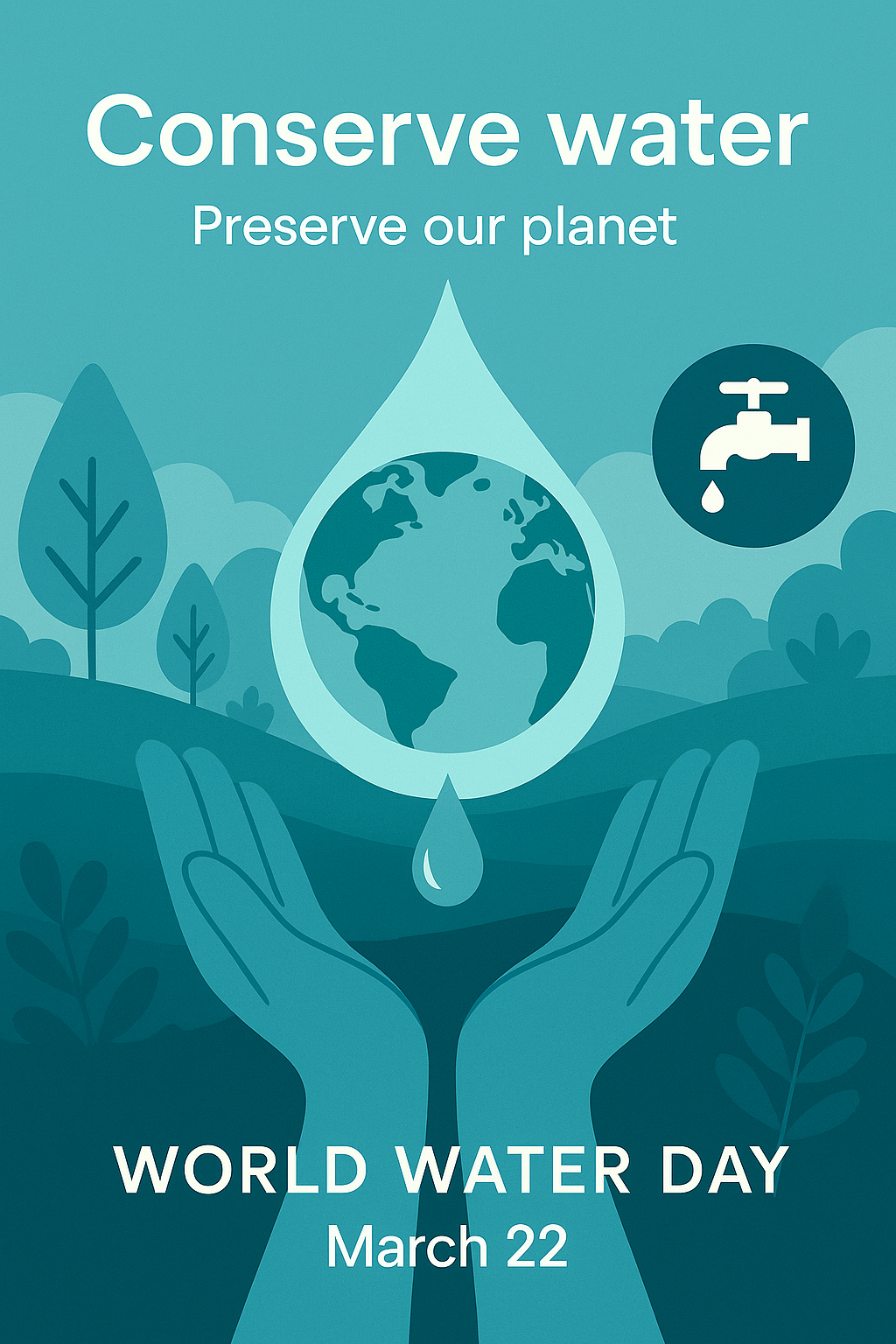 /Collection: /by davooda/Type: PNG/Illustrative poster promoting water conservation with thematic elements representing sustainability and environmental stewardship. Ideal for educational and advocacy campaigns.
