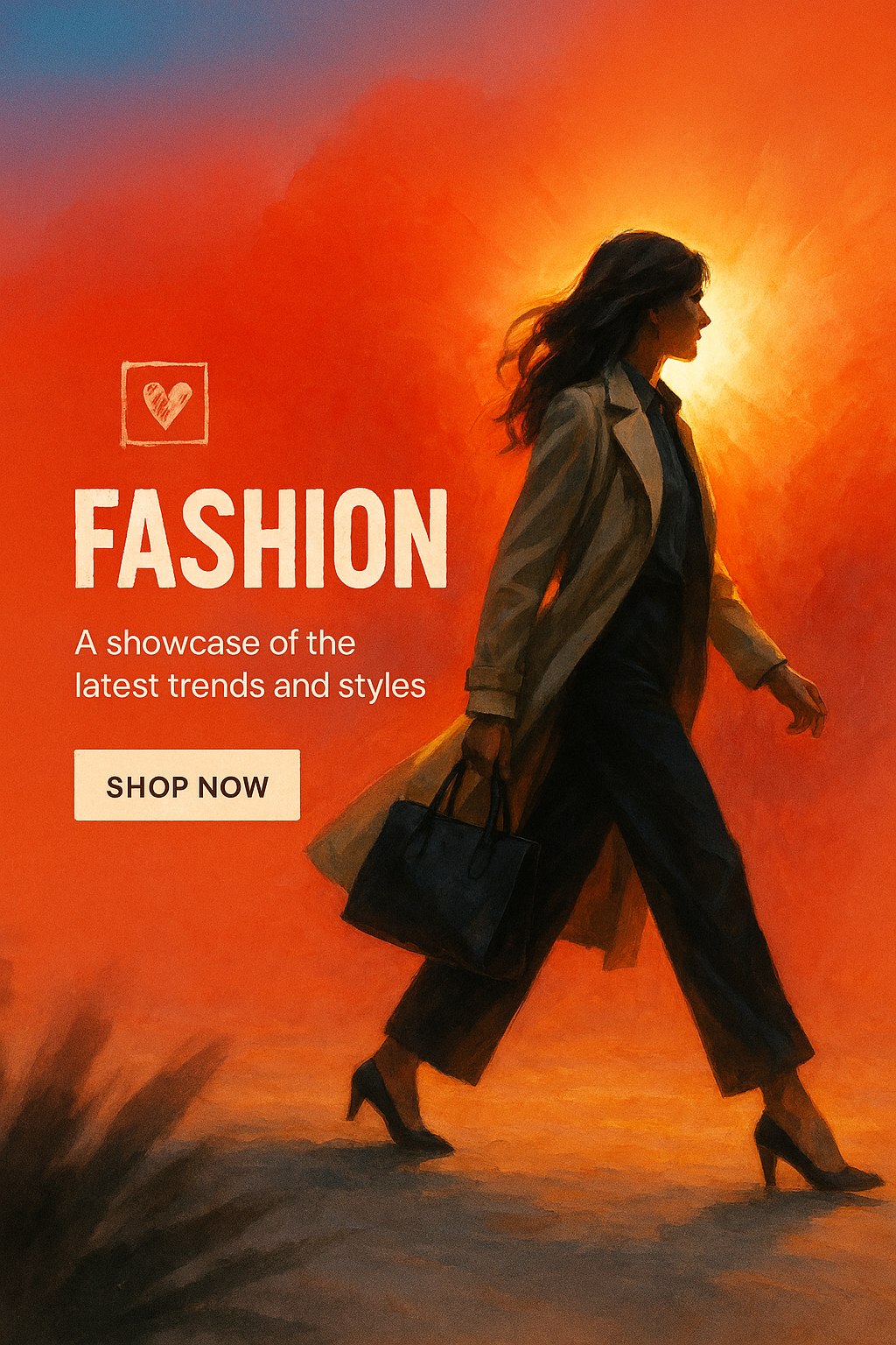 /Collection: /by davooda/Type: PNG/This is a promotional fashion graphic featuring a stylish model walking, designed for social media or advertising. The warm color palette and artistic style convey a sense of elegance.