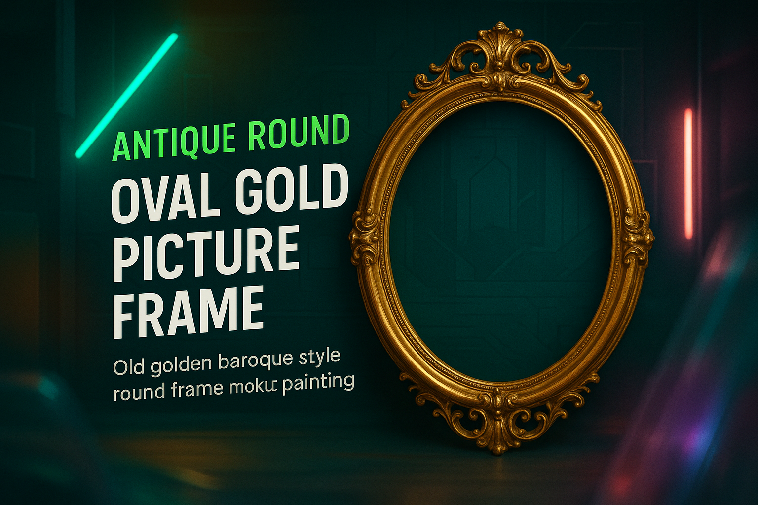 Stylish image featuring an ornate gold oval picture frame against a dark backdrop, ideal for showcasing art or photography in a luxurious setting.