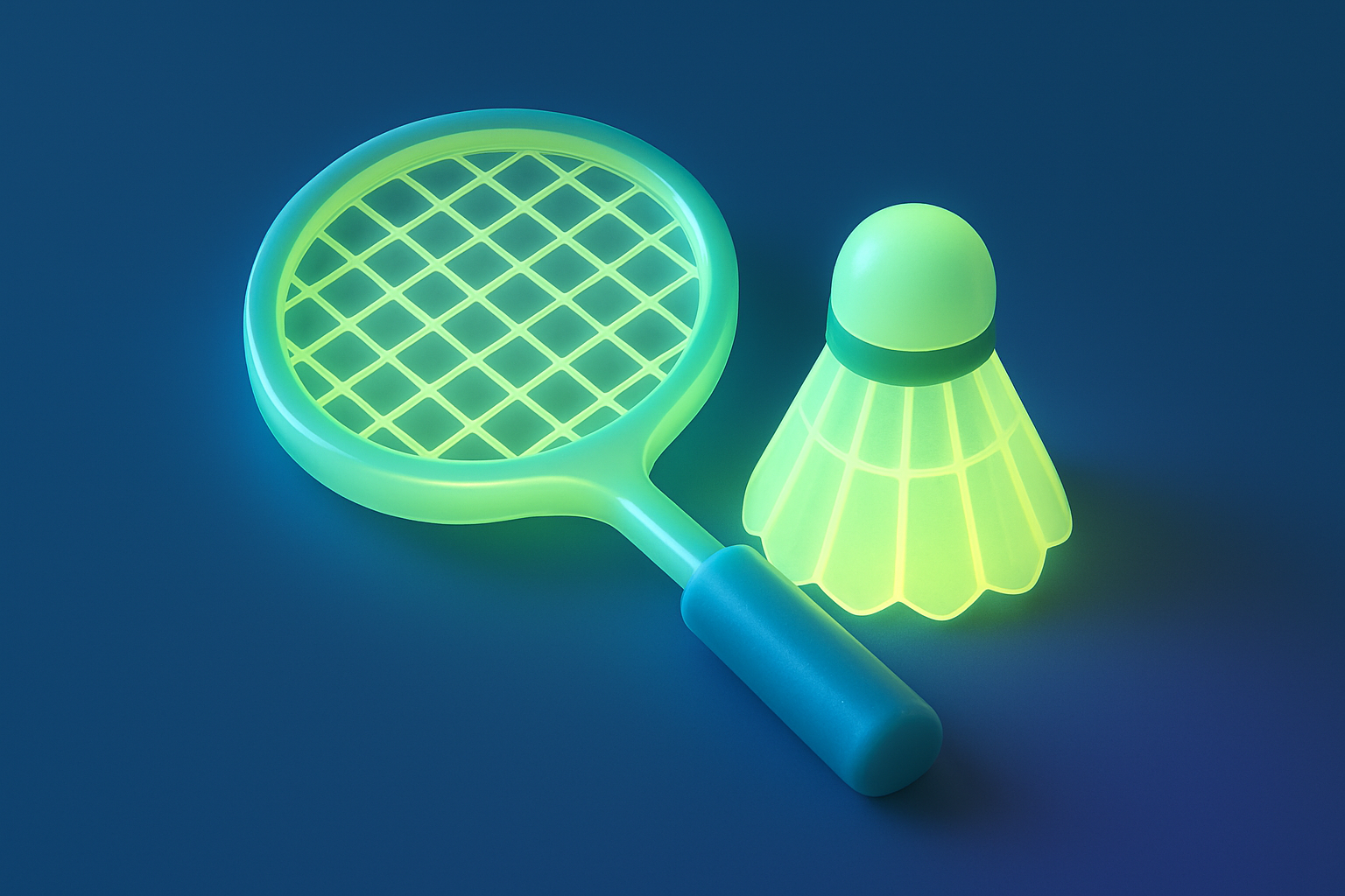 /Collection: /by davooda/Type: PNG/This image showcases a 3D badminton icon featuring a glowing racket and shuttlecock. The color palette includes light yellow-green, solid blue, and violet, set against a solid blue background.