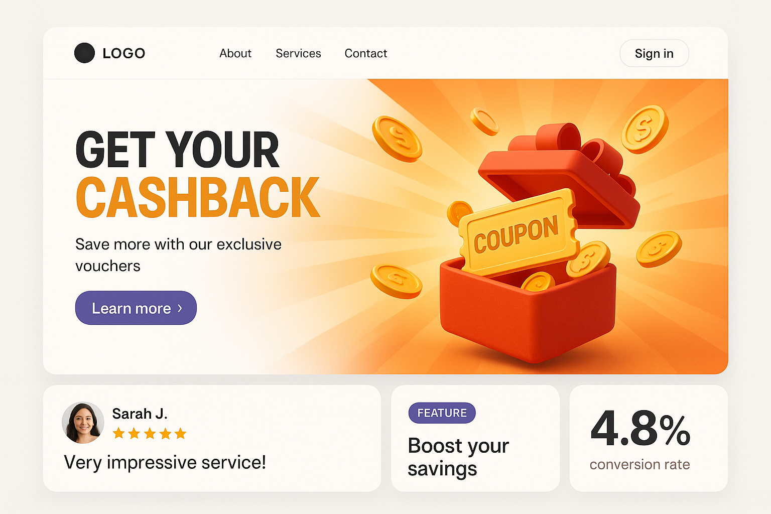 3D Landing Page Design Featuring Coupons and Cashback Offer