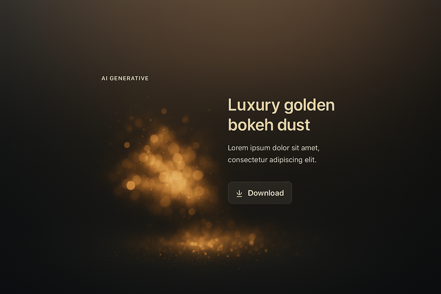 A luxurious scene featuring golden bokeh dust against a dark background, with a minimalistic design including a download button and text block.