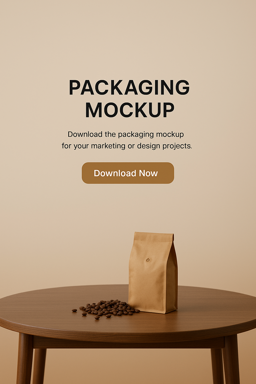 /Collection: /by davooda/Type: PNG/A brown coffee paper bag mockup is displayed on a wooden table alongside spilled coffee beans. The scene captures a minimalistic design with a smooth gradient background, making it ideal for marketing and design projects.