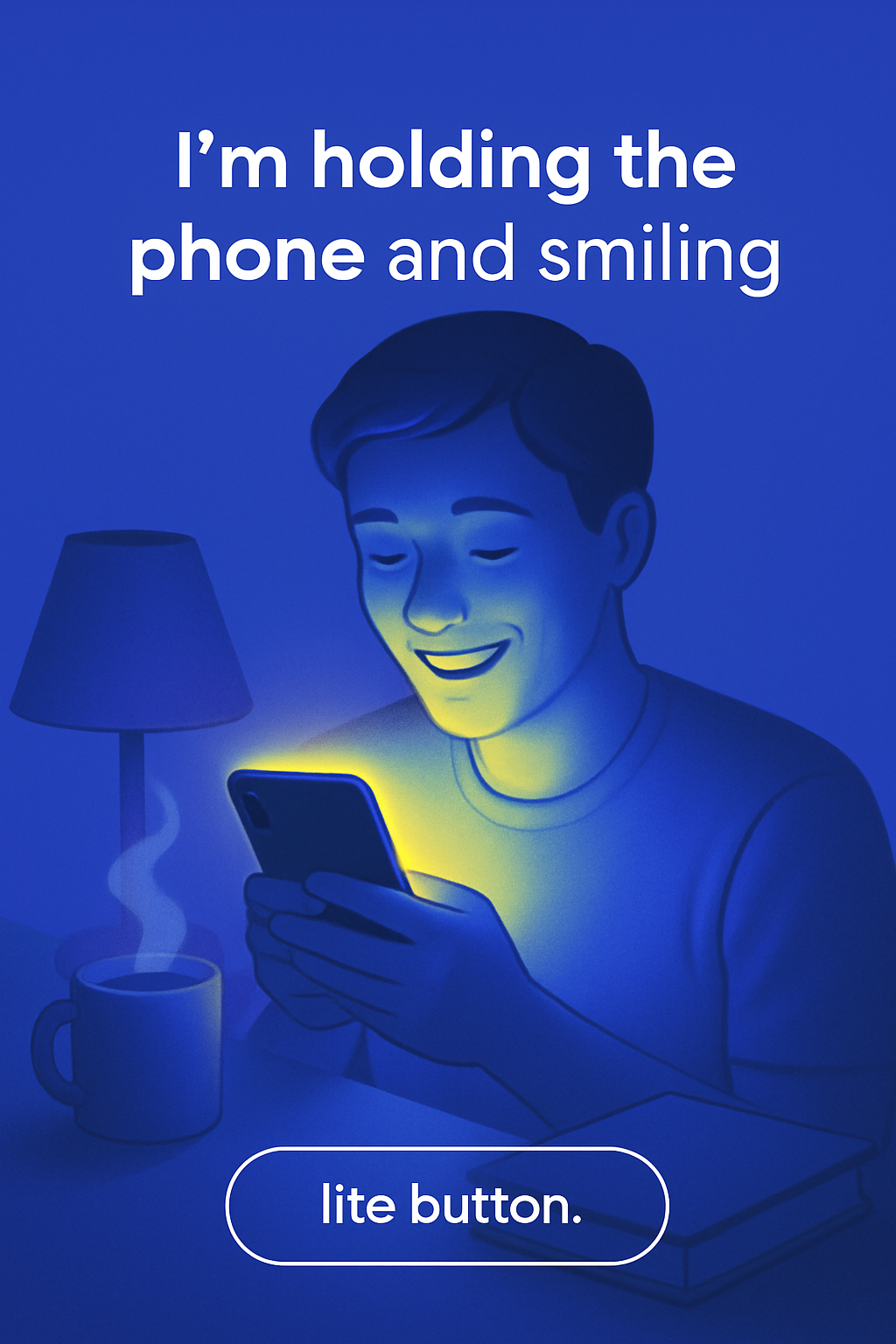 A person is smiling while holding a phone, illuminated by a soft glow. The scene features a lamp and a cup, set against a vibrant blue background, enhancing the cheerful atmosphere.