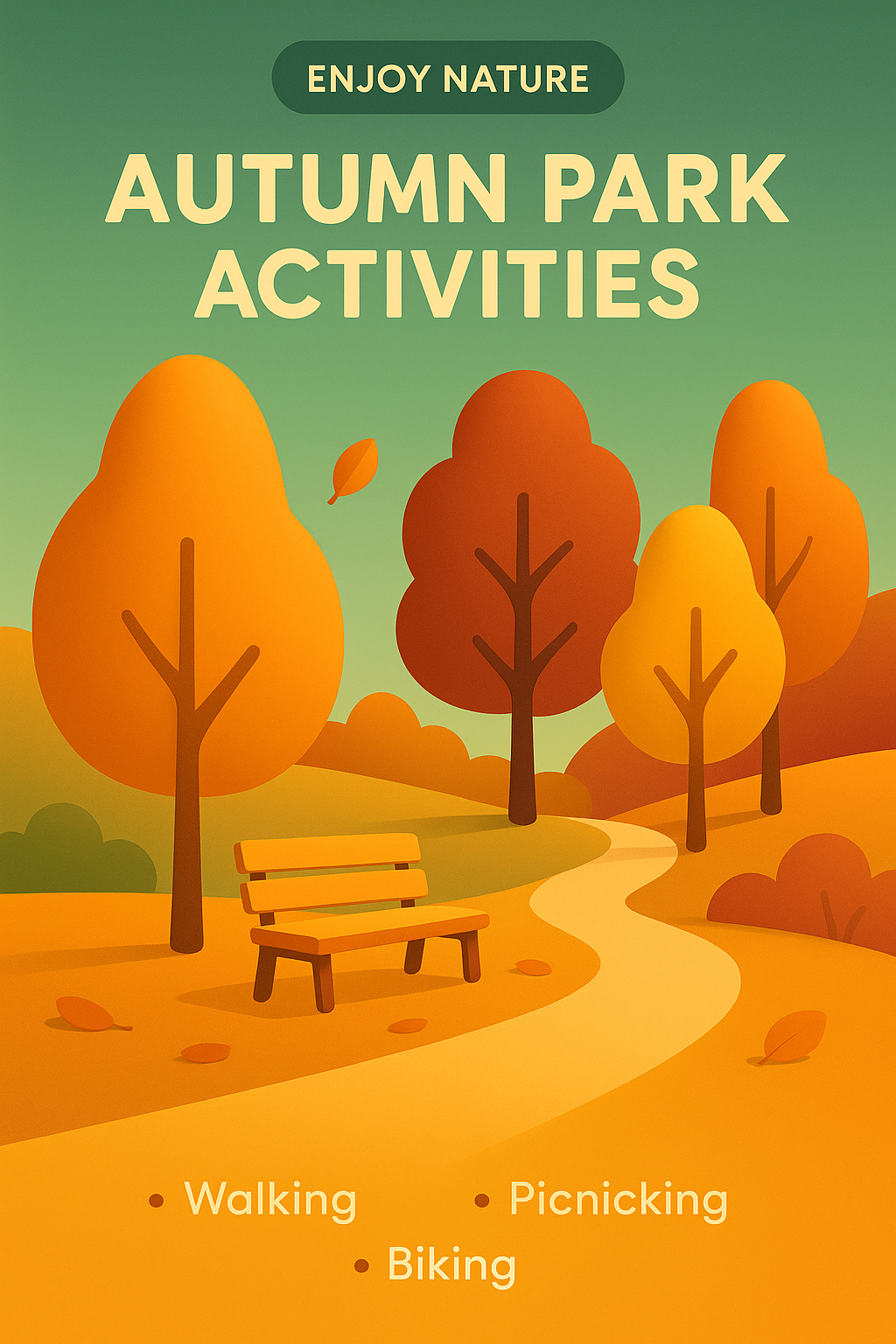 Colorful and inviting graphic showcasing various outdoor activities in an autumn park setting, ideal for promoting nature engagement.