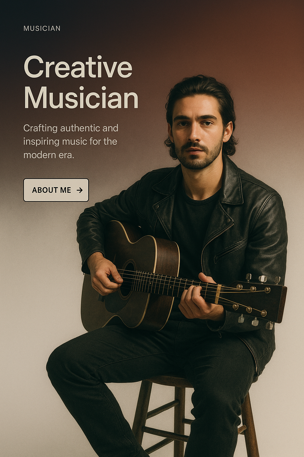 A musician sits casually with an acoustic guitar, showcasing a stylish look. The background features a gradient from dark to white, enhancing the visual appeal.