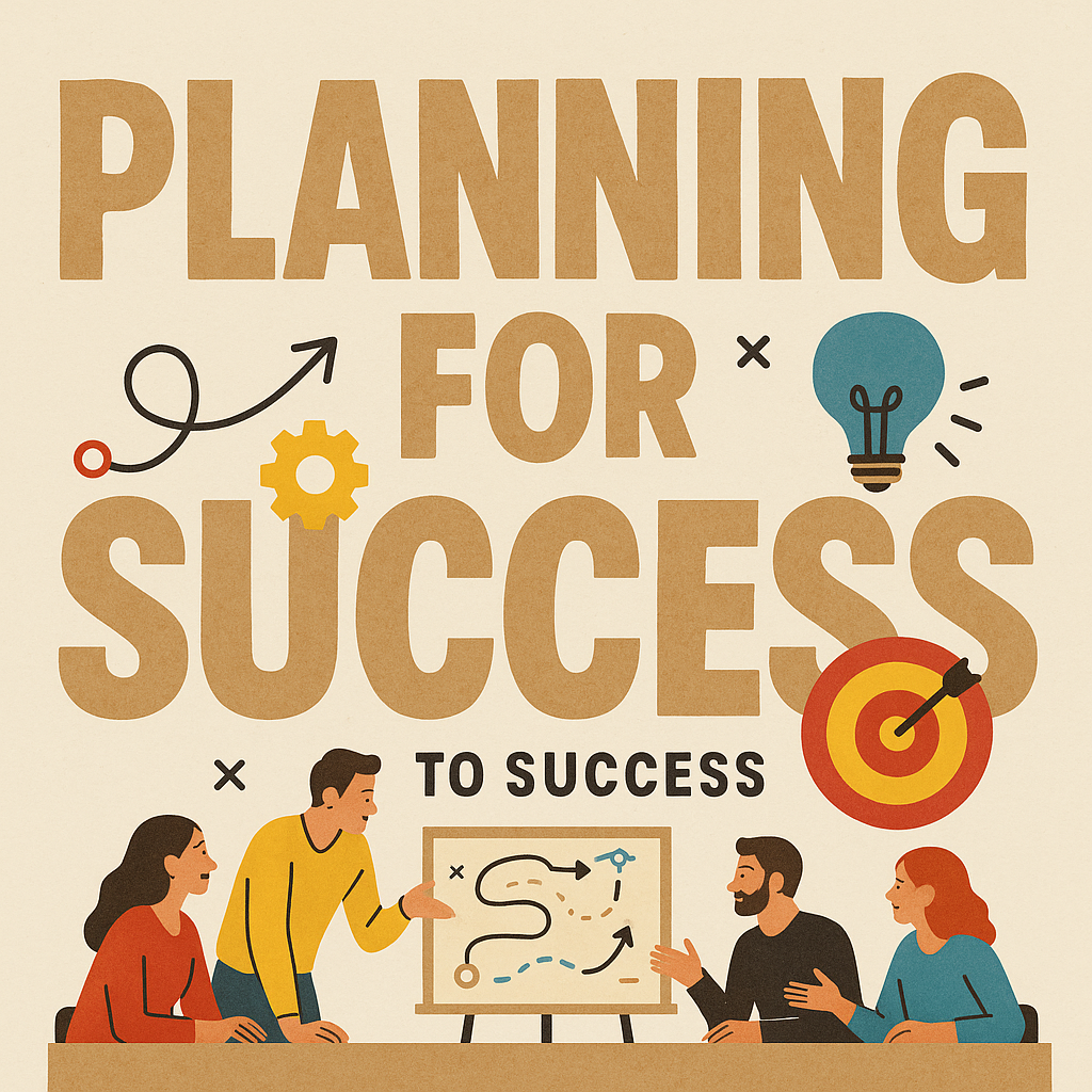 /Collection: /by davooda/Type: PNG/Colorful graphic illustrating a brainstorming session on planning for success, featuring diverse characters and symbols representing ideas, goals, and strategies. Ideal for motivational content and educational materials.
