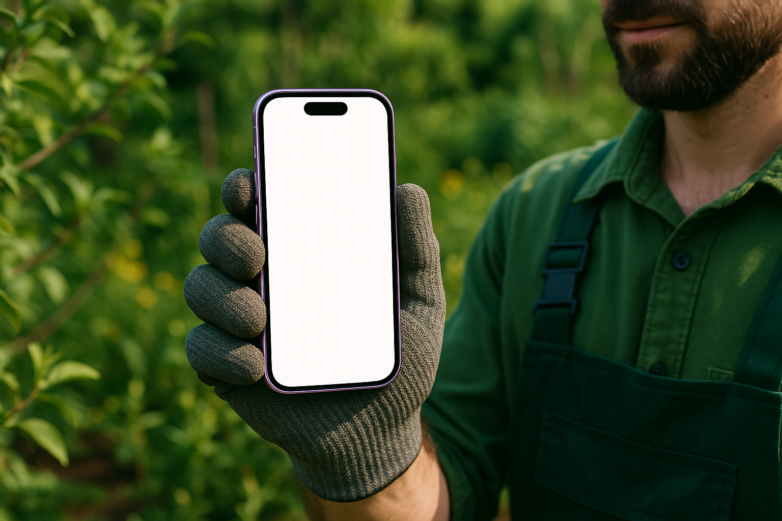 A man dressed as a gardener, wearing gloves, holds a purple smartphone with a blank screen in a vibrant garden. The lush greenery creates a serene backdrop.