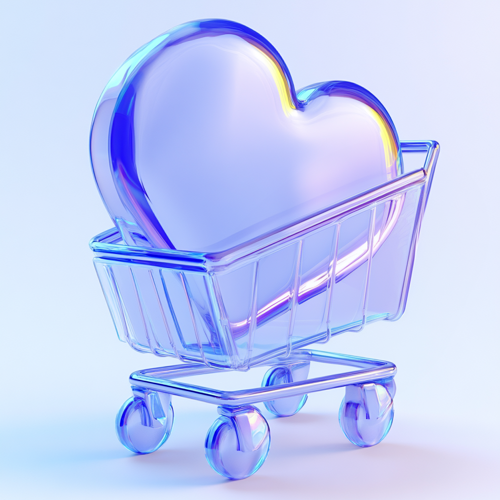 A modern and artistic 3D rendering of a shopping cart containing a translucent heart. The design uses soft colors and smooth shapes, ideal for e-commerce or love-themed marketing.
