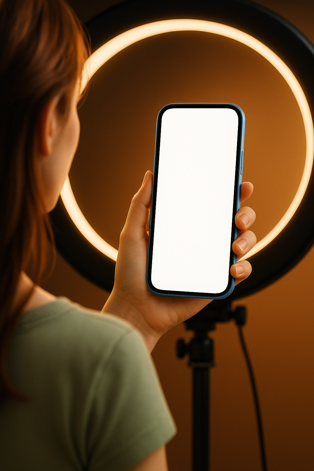 /Collection: /by davooda/Type: PNG/A dynamic shot featuring a blogger holding a blue phone in front of a ring light. The phone has a blank screen, enhancing the focus on the device. The angle is from behind the individual, capturing the essence of content creation.
