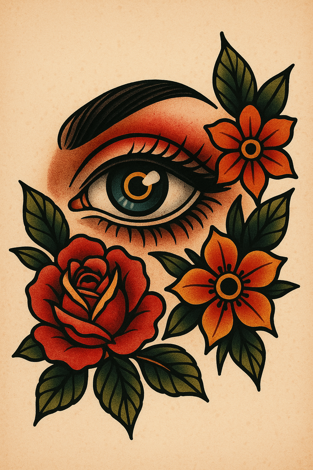 /Collection: /by davooda/Type: PNG/This is a vibrant illustrative artwork featuring a stylized eye surrounded by roses and flowers. The design has a bold, traditional tattoo style with rich colors, suitable for art enthusiasts and tattoo design inspiration.