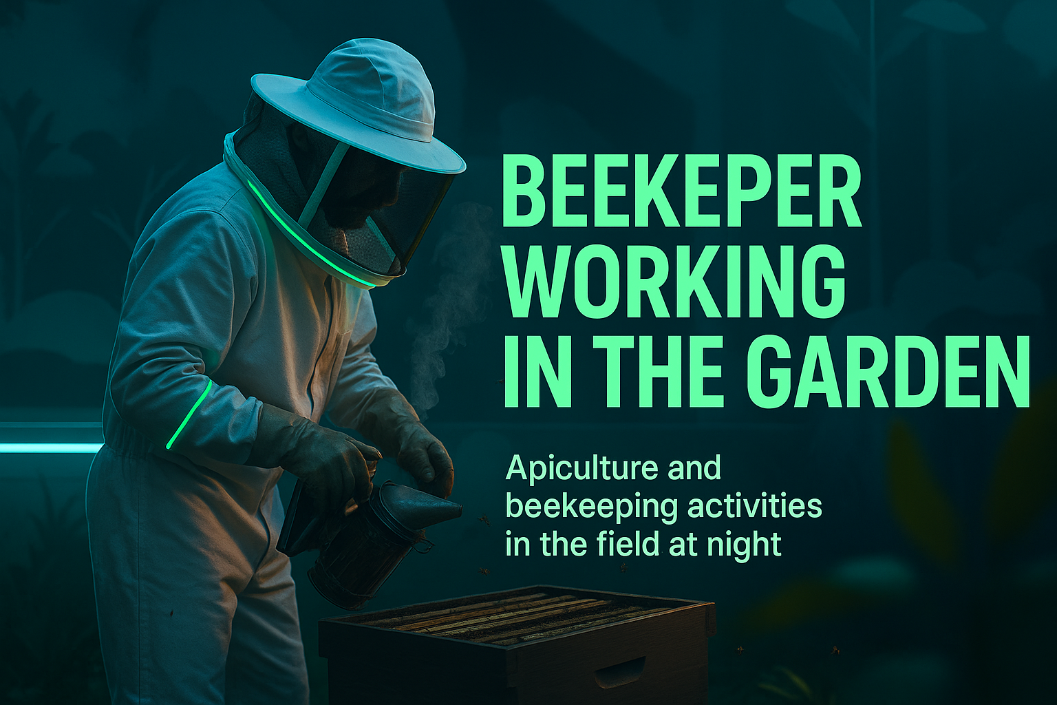 /Collection: /by davooda/Type: PNG/A visually striking image of a beekeeper working in a garden at night. The scene highlights apiculture activities with a modern aesthetic, ideal for environmental or agricultural themes.
