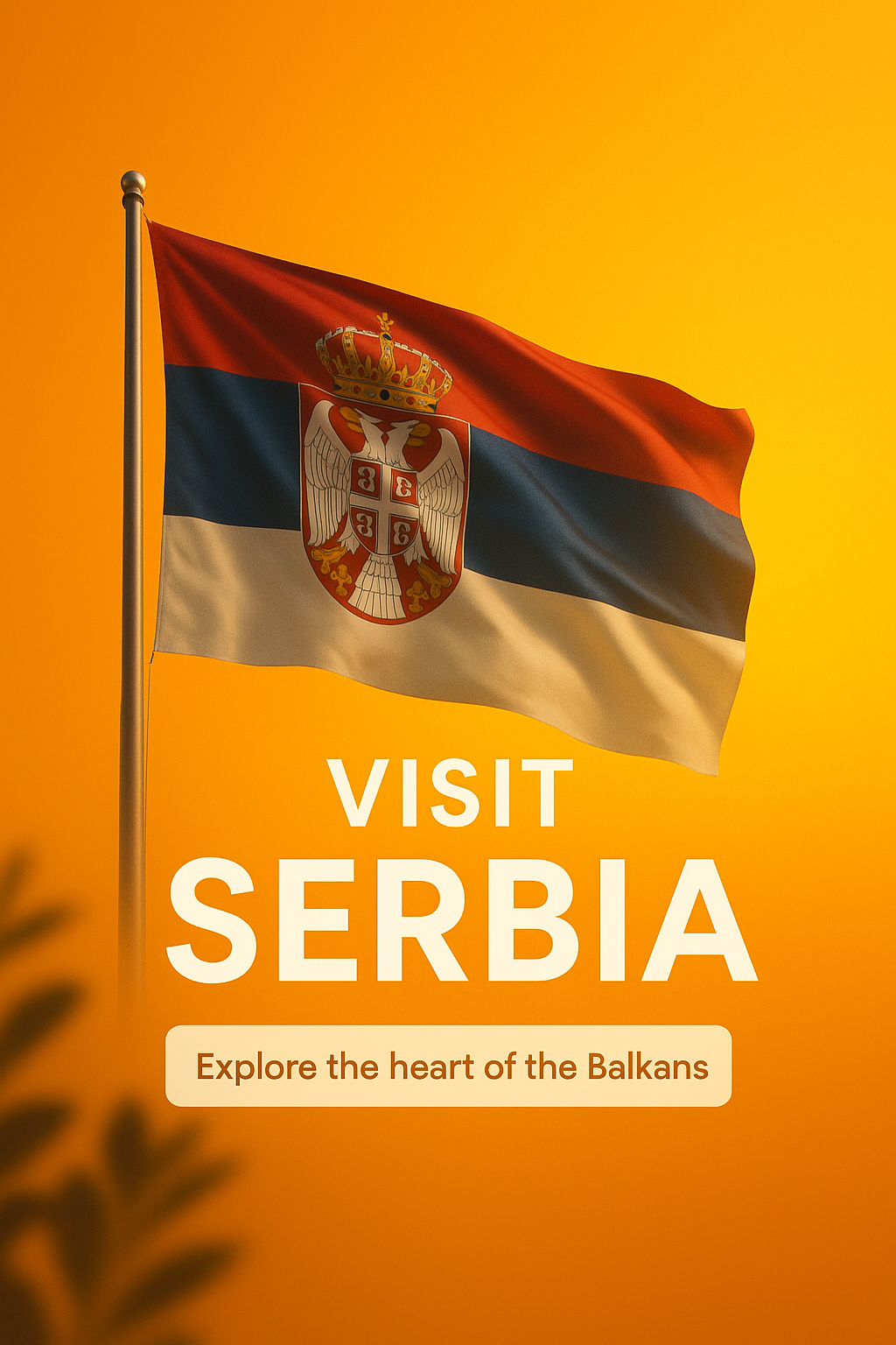 This is a promotional graphic featuring the Serbian flag against a vibrant orange background. It aims to attract tourists by highlighting Serbia as a key destination in the Balkans.
