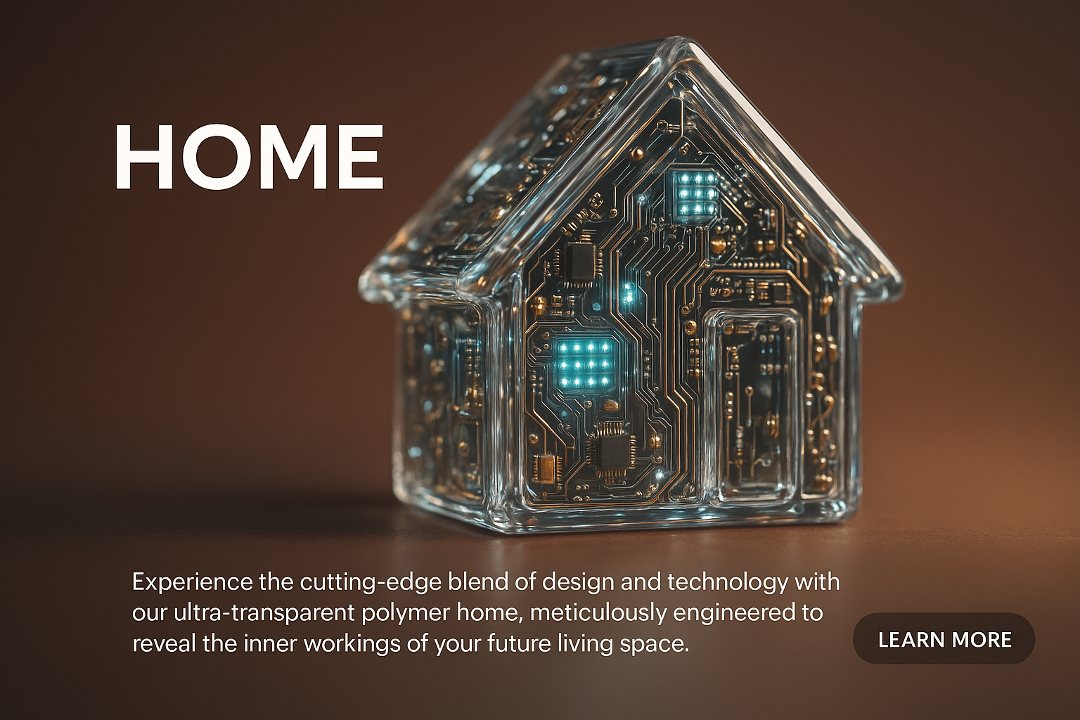 /Collection: /by davooda/Type: PNG/A hyperrealistic close-up of a transparent home, showcasing intricate circuitry and glowing LEDs. The sleek design features reflective metallic components, creating a captivating visual experience.