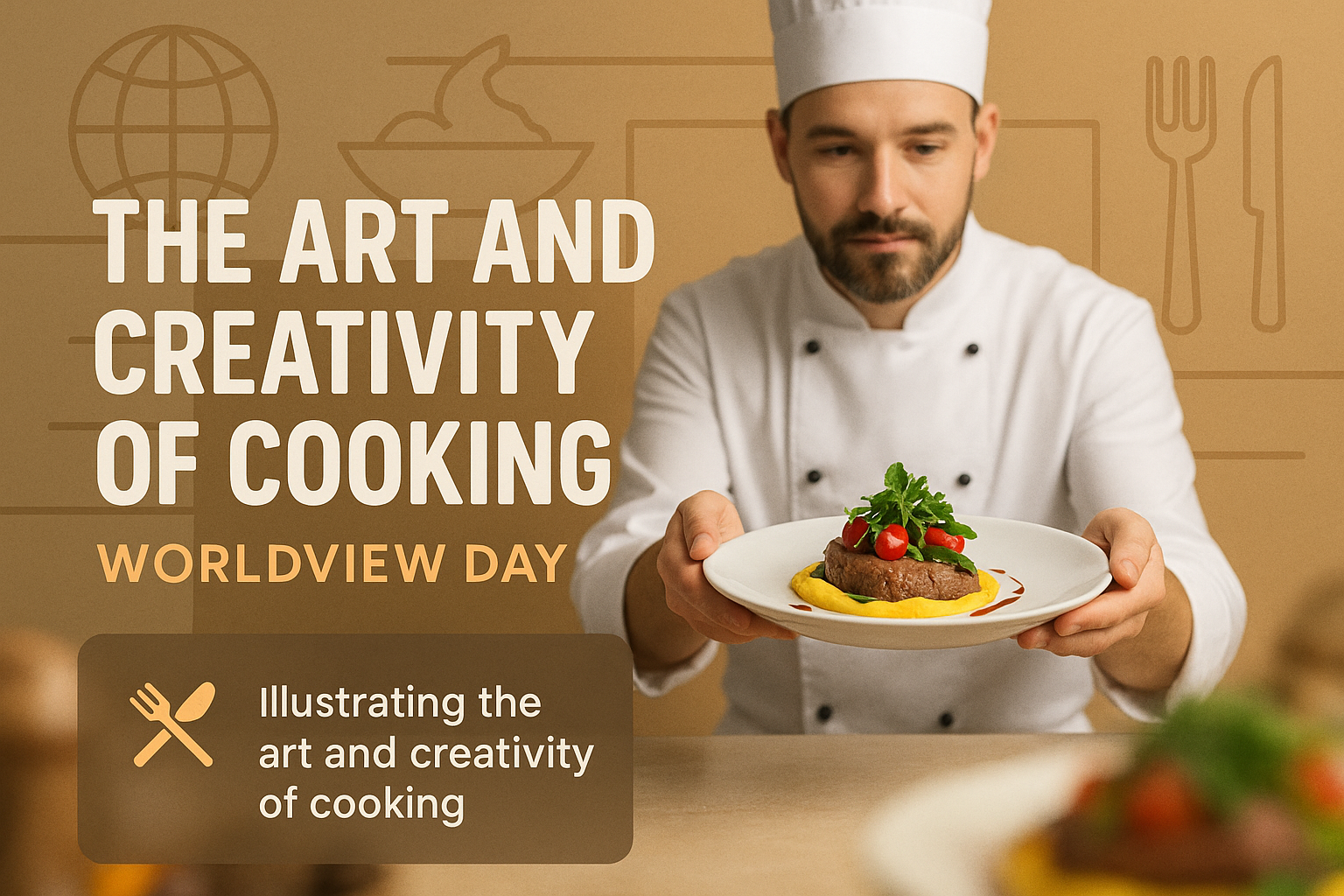Stylish promotional graphic celebrating the art of cooking for Worldview Day. Features a chef presenting a beautifully plated dish, blending modern design with culinary themes.