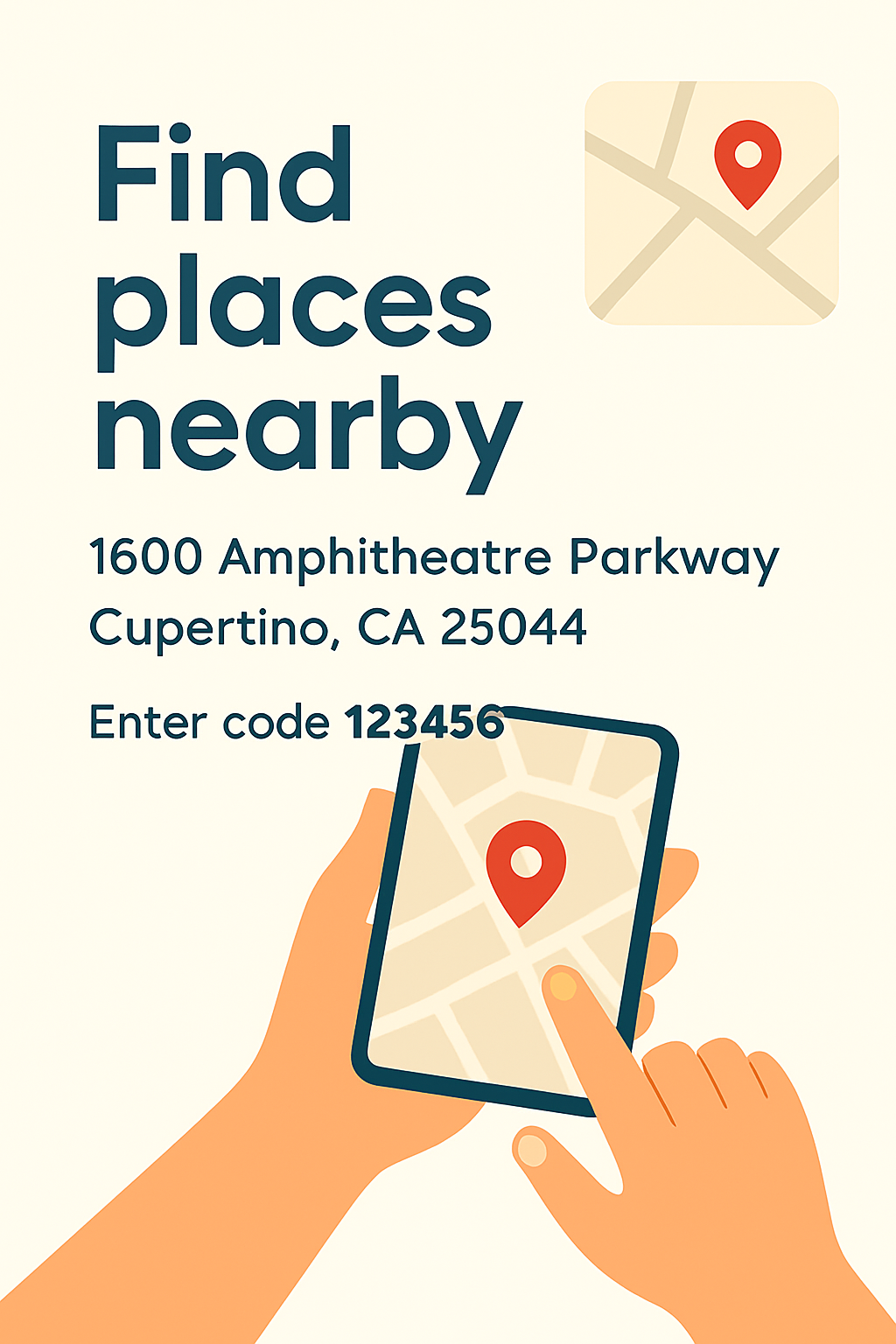 Illustrative graphic showcasing a mobile app interface that helps users find nearby places. The design features a hand interacting with a smartphone displaying a map.