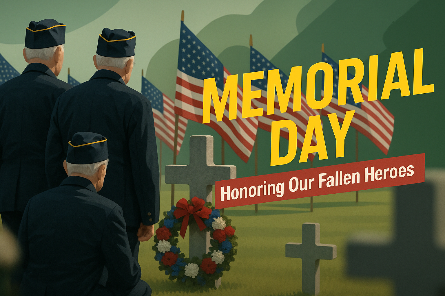 /Collection: /by davooda/Type: PNG/A poignant graphic representing Memorial Day, featuring veterans in front of gravestones adorned with flags and a wreath, ideal for commemorative events and social media posts.
