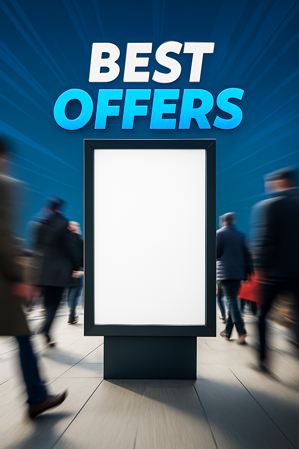 /Collection: /by davooda/Type: PNG/A vibrant advertising scene featuring a clean, blank signboard surrounded by blurred figures of people walking by. The background showcases dynamic lines radiating outward, enhancing the sense of motion.