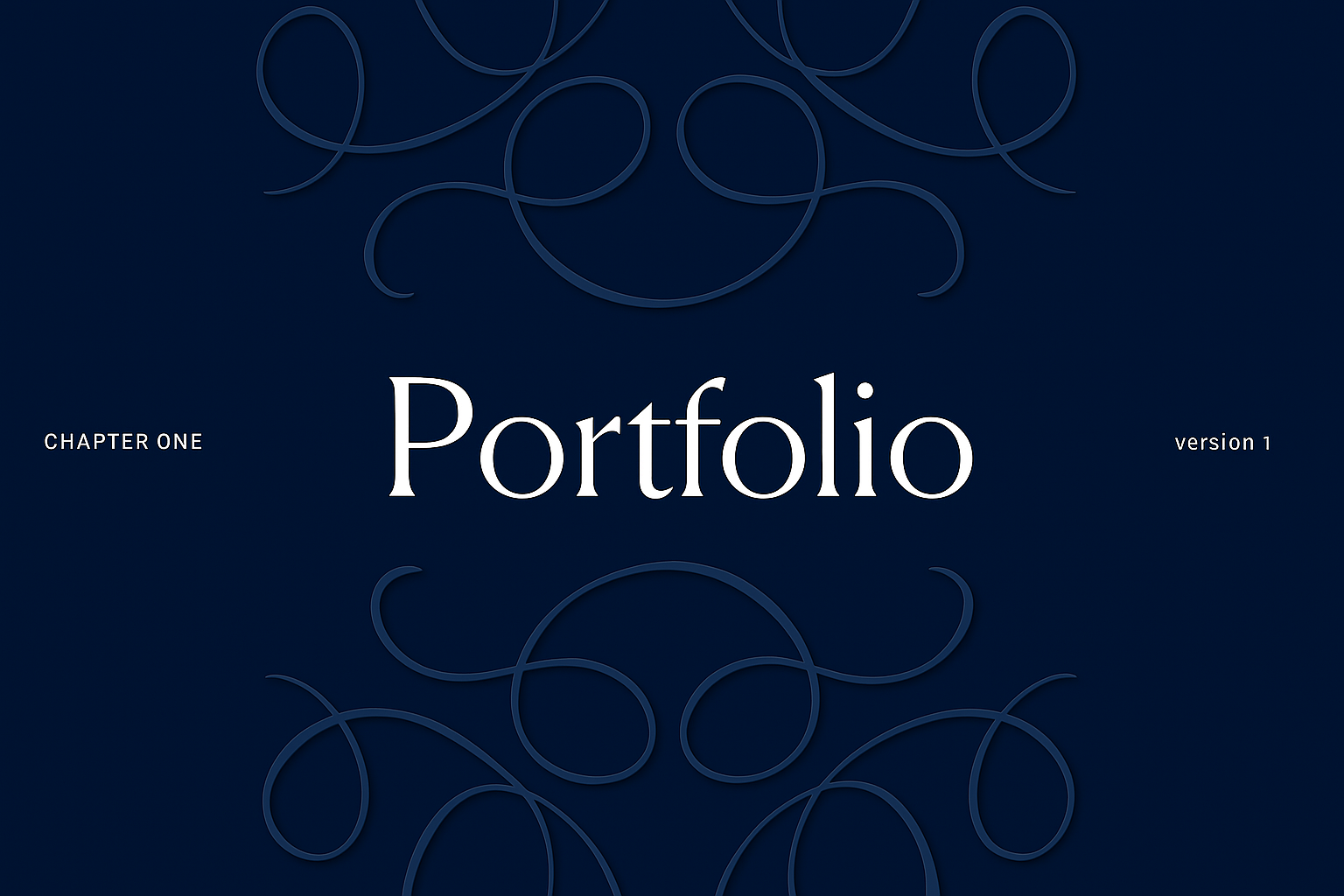 A sophisticated portfolio cover featuring intricate decorative patterns and a deep blue background. The title 'Portfolio' is prominently displayed in a stylish font.