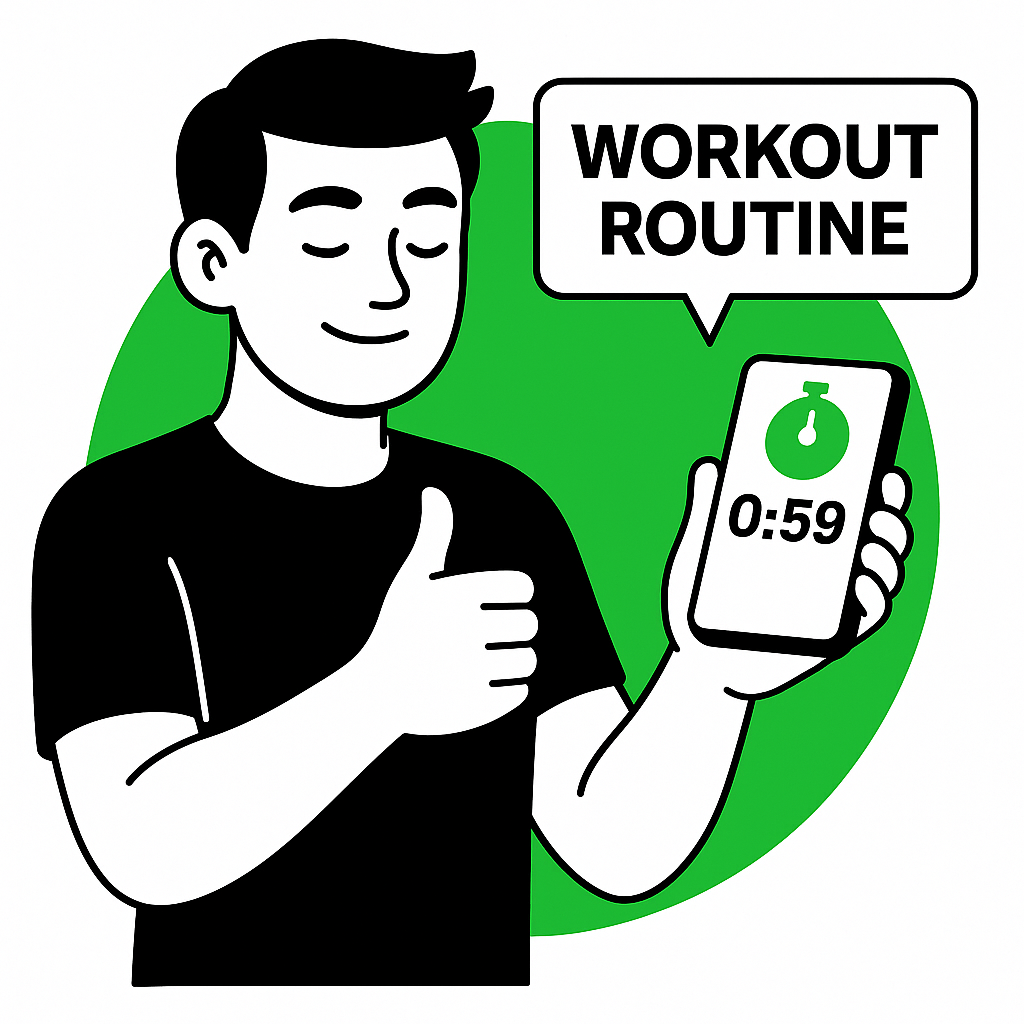 /Collection: /by davooda/Type: PNG/A graphic illustration depicting a man giving a thumbs up while holding a phone displaying a timer, symbolizing workout routines. The vibrant color scheme and simple design make it ideal for fitness-related content.
