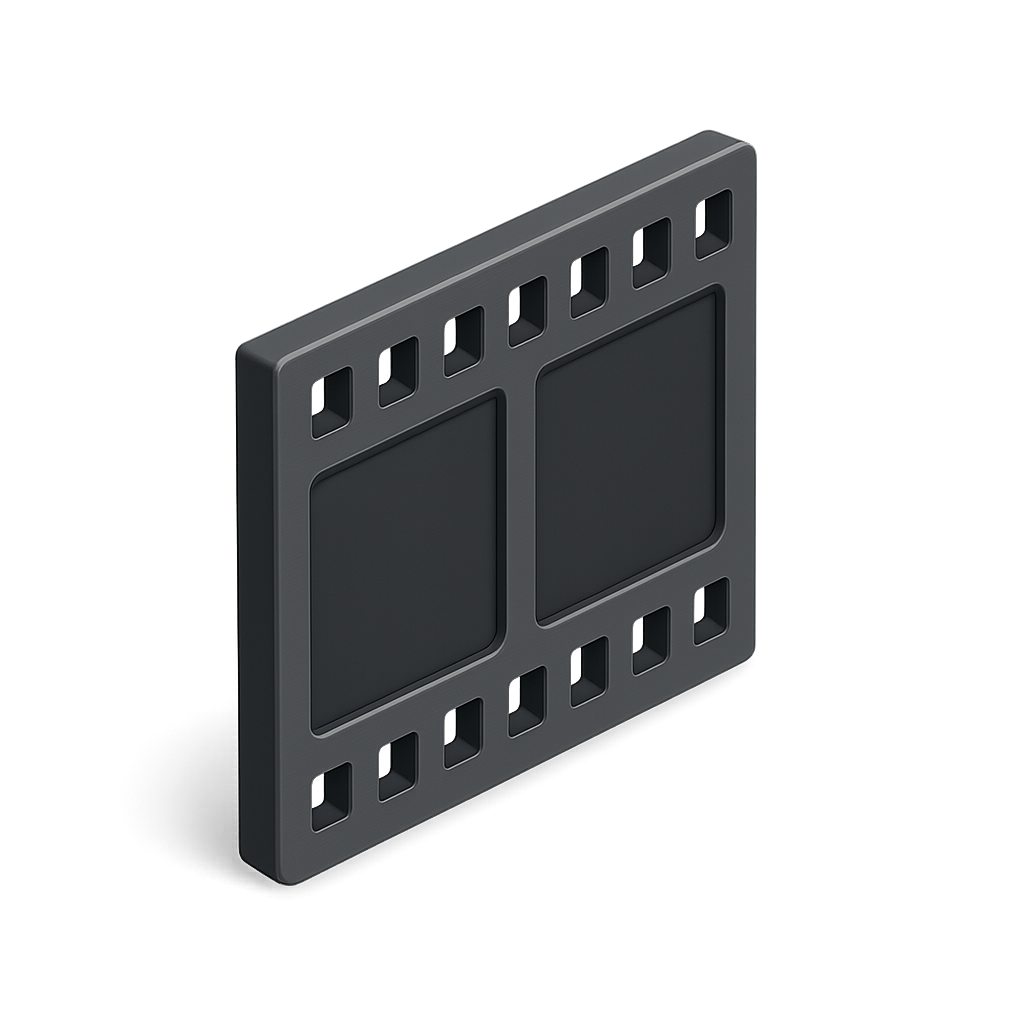 A sleek 3D representation of a film negative strip, featuring a minimalist design with a transparent background. The icon is shown from a three-quarter view, emphasizing its depth and volumetric qualities.