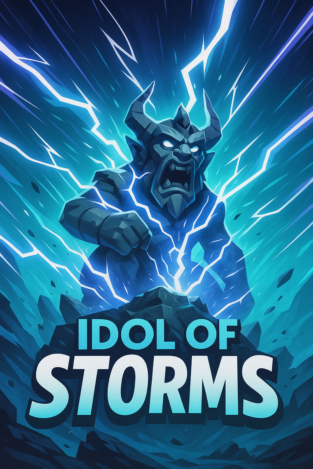 /Collection: /by davooda/Type: PNG/A striking illustration of the Idol of Storms, showcasing dynamic lightning and powerful energy. The design features a bold title and layered composition with a smooth gradient background.