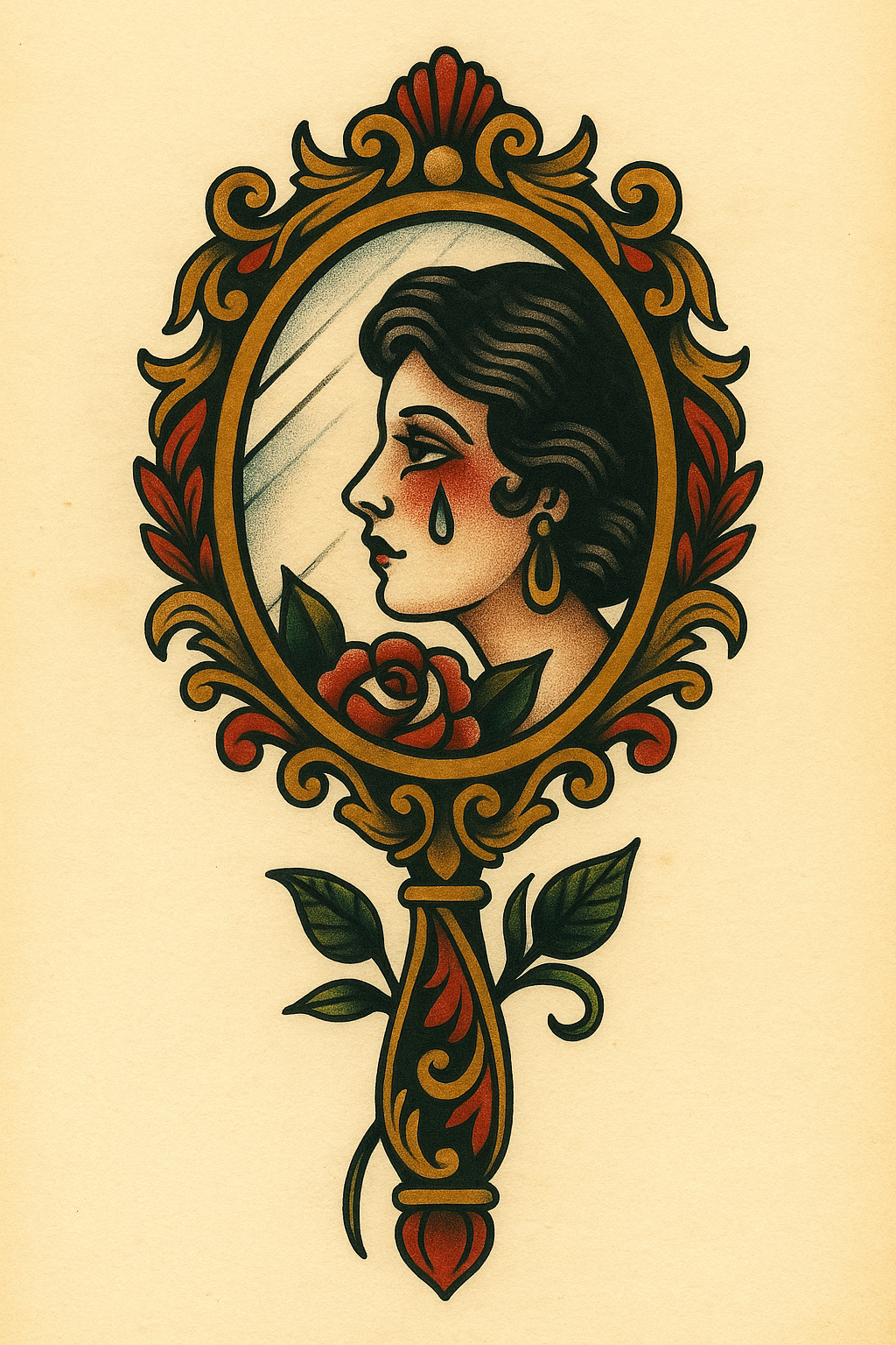 Tattoo Design Featuring Silhouette in a Mirror with Rose
