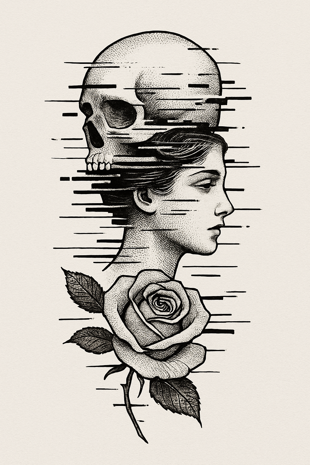 /Collection: /by davooda/Type: PNG/This image features a surrealistic black and white illustration depicting a woman's profile with a skull above her head and a rose below. Ideal for art enthusiasts and tattoo design.