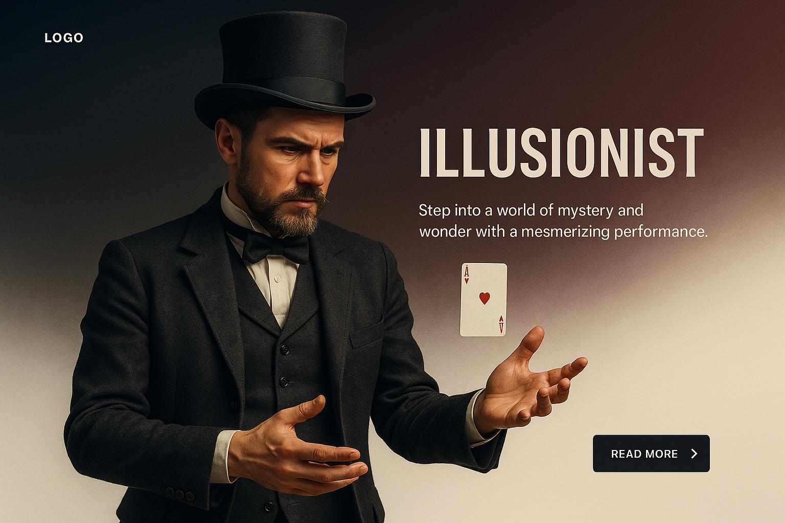 /Collection: /by davooda/Type: PNG/A sophisticated web page design featuring an illusionist in a top hat, showcasing a card trick. The layout includes a logo, engaging text, and a call-to-action button.