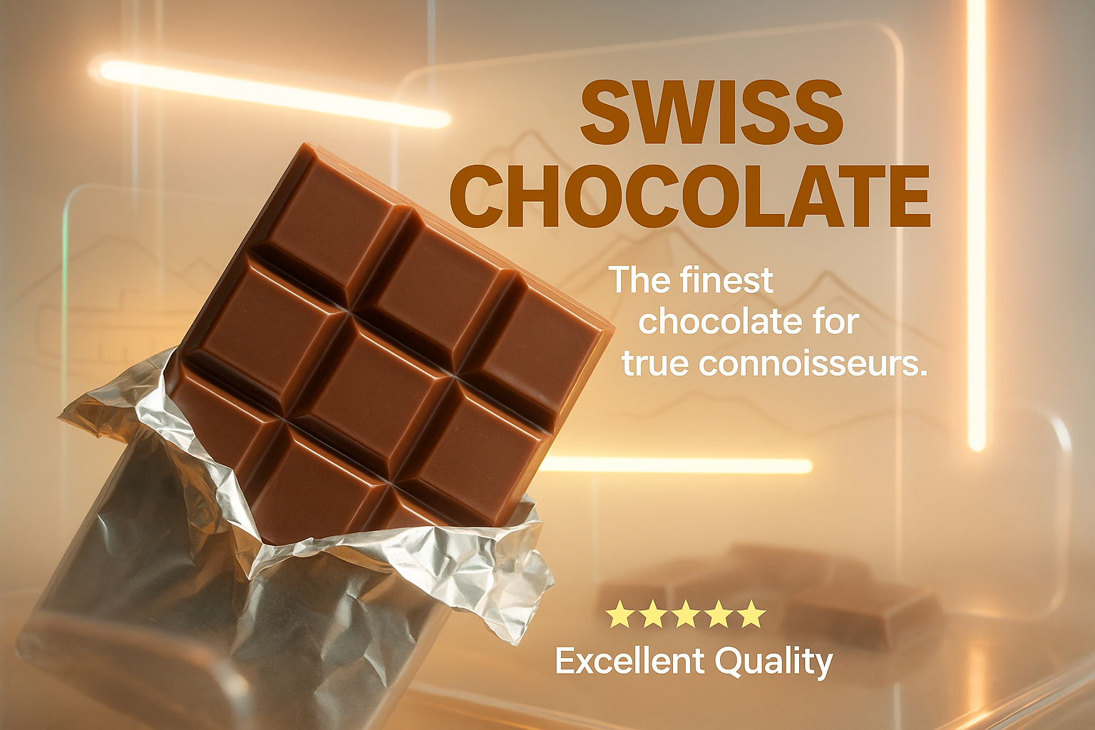 Visually appealing promotional image showcasing a bar of Swiss chocolate with high-quality packaging, ideal for gourmet marketing and advertising.