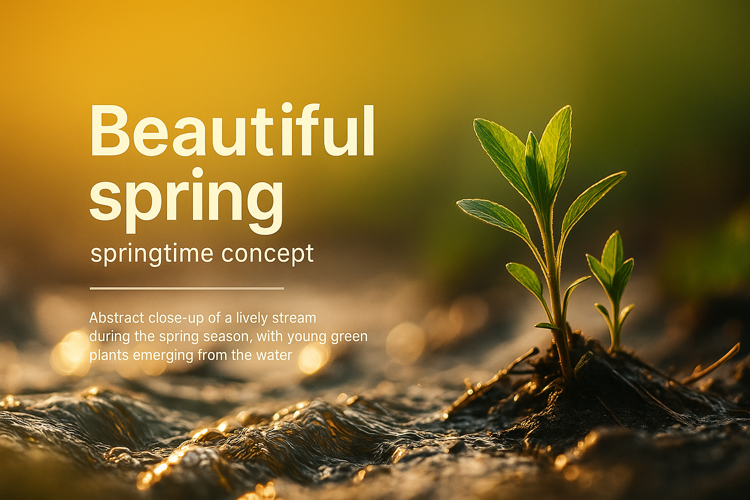 A close-up view of a lively stream during spring, featuring young green plants emerging from the water. The scene captures the essence of springtime with a warm, dynamic background.