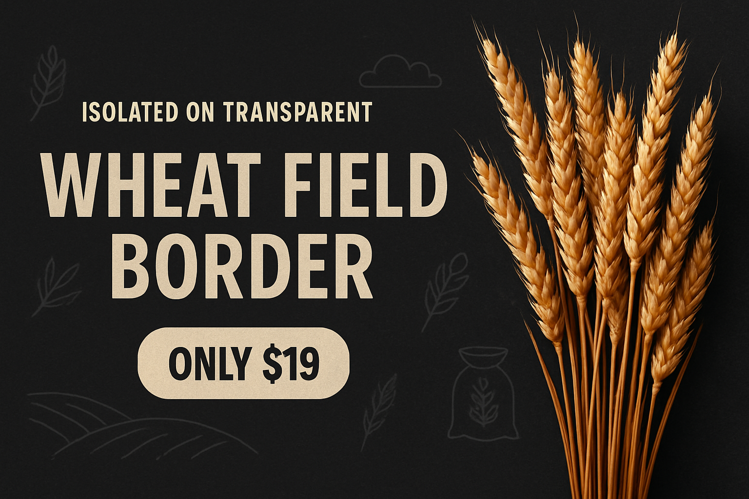 /Collection: /by davooda/Type: PNG/This image features a wheat field border on a textured dark background, emphasizing bold sans-serif typography. The design includes a large headline, a price tag, and simple contour drawings, creating an energetic advertisement.