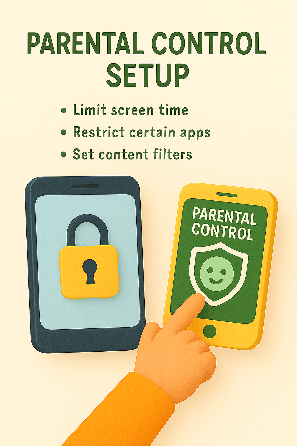 /Collection: /by davooda/Type: PNG/Engaging digital illustration showcasing parental control features on smartphones, designed to educate parents about screen time management and app restrictions.