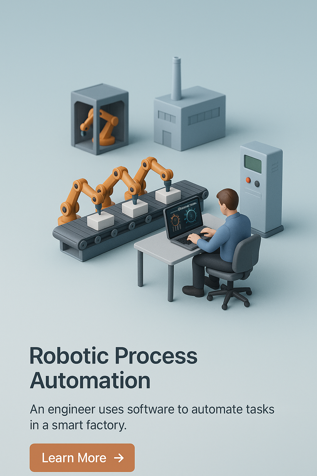 A 3D scene depicting a robotic process automation engineer working on a laptop in a smart factory environment, featuring robotic arms and factory machinery.