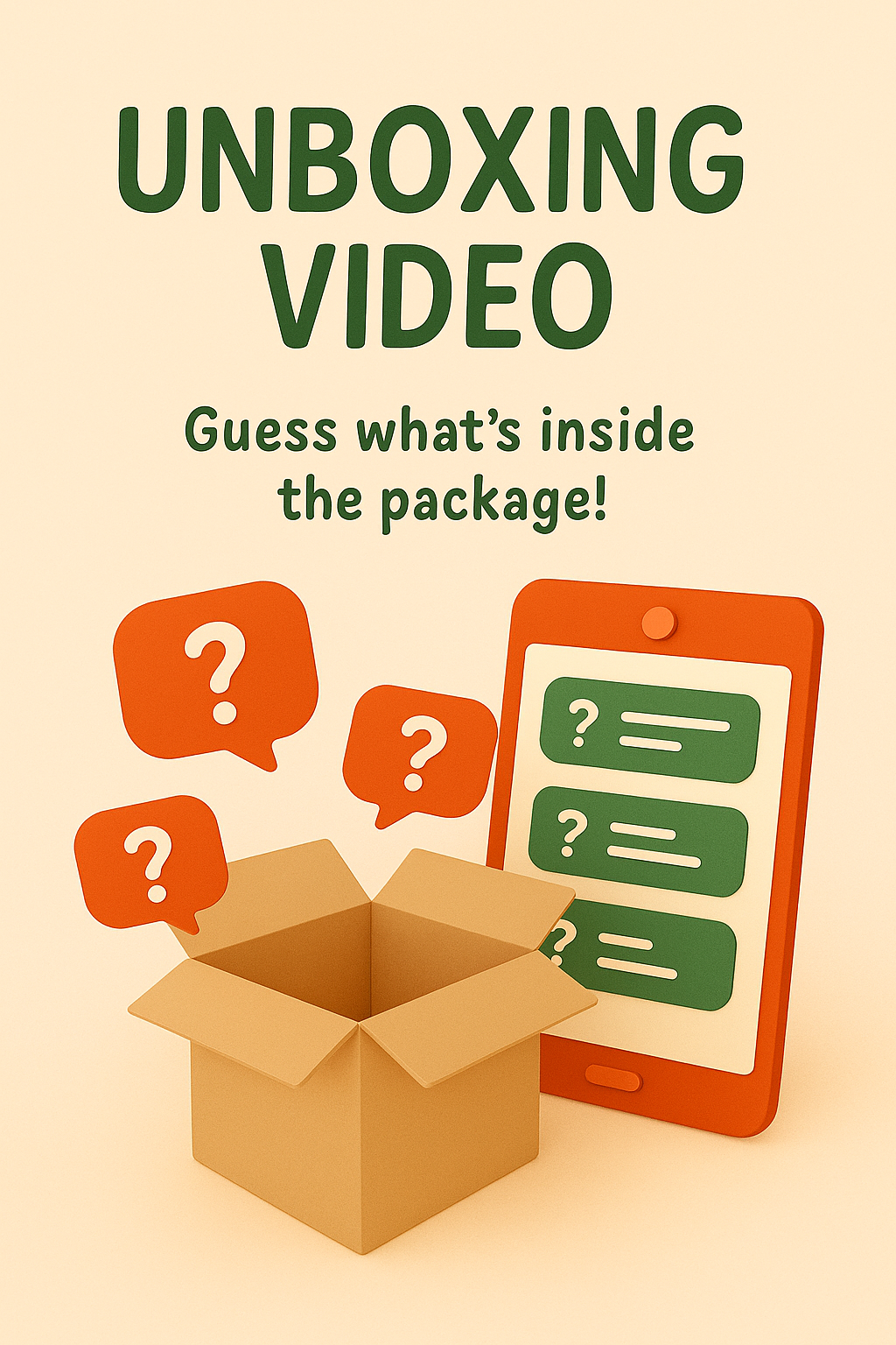 Vibrant promotional graphic for an unboxing video featuring a package, question marks, and a smartphone, ideal for social media engagement.