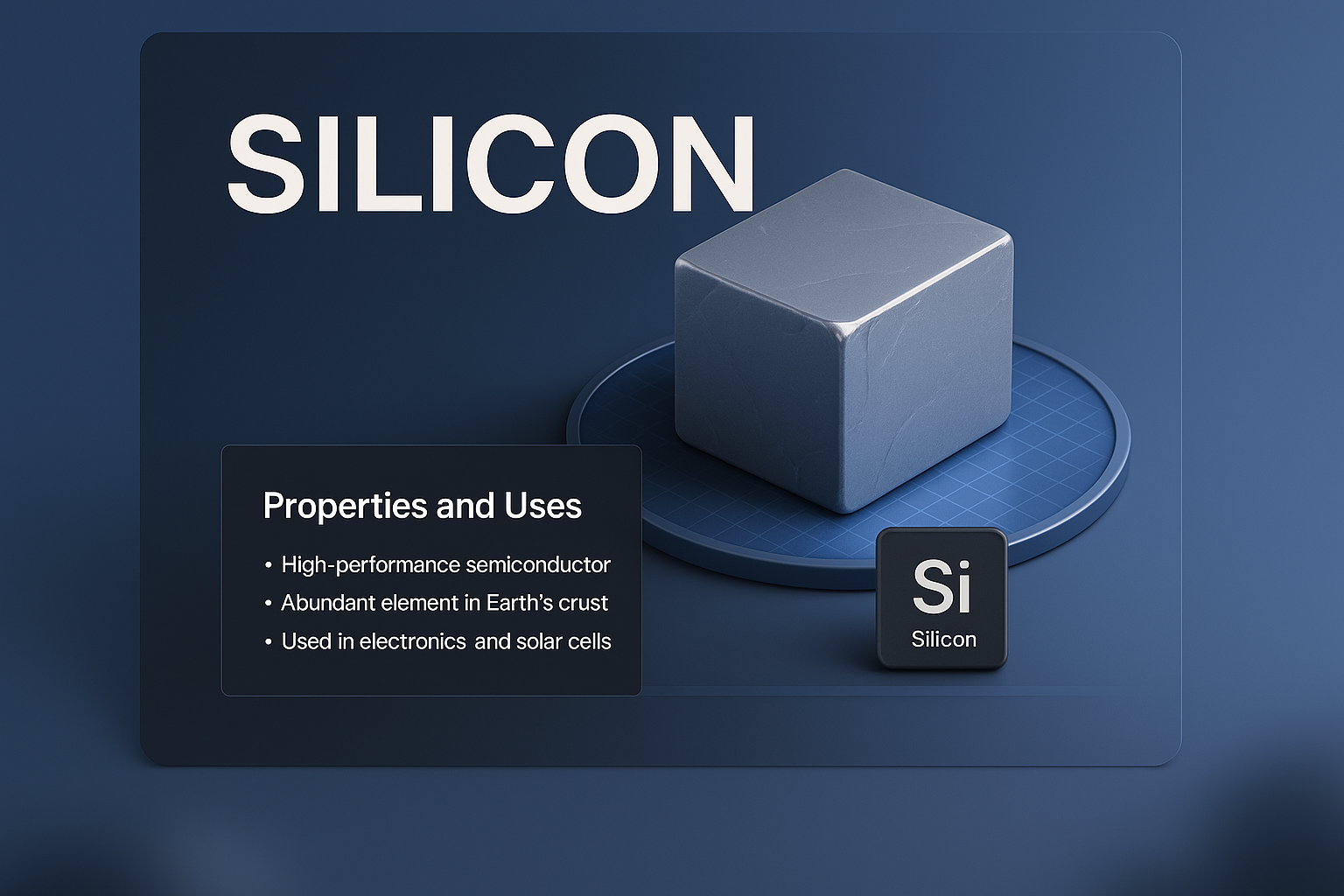 /Collection: /by davooda/Type: PNG/A 3D illustration of a silicon block set against a gradient background. Includes integrated text and visual elements detailing its properties and uses, designed cohesively.