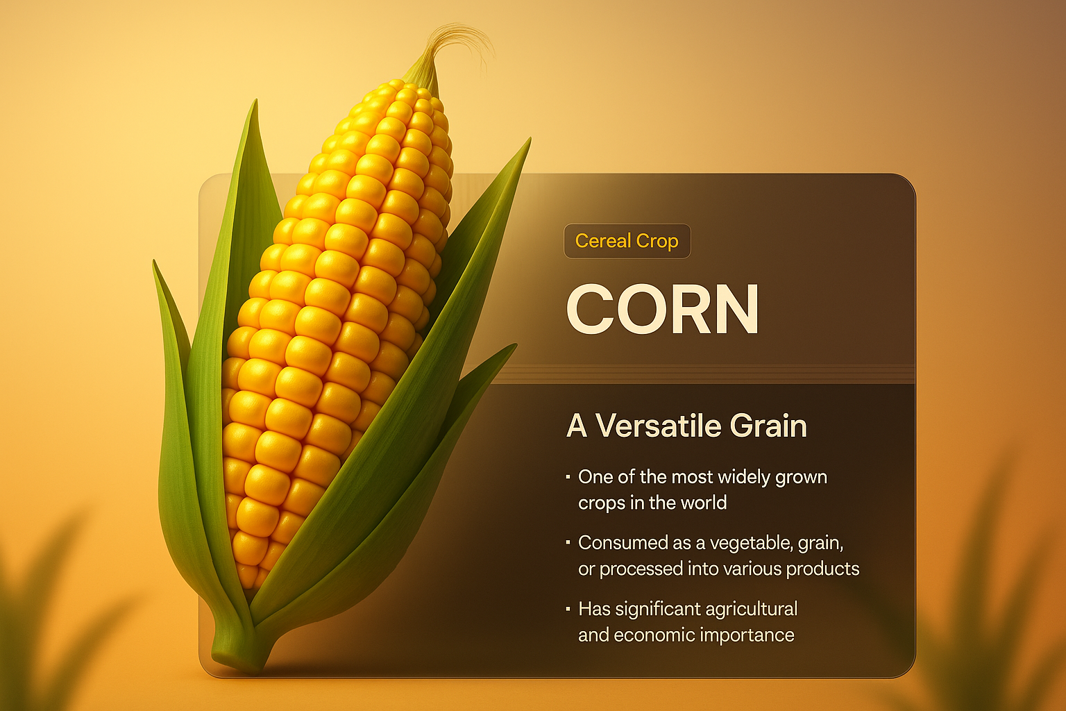 A detailed 3D rendering of corn featuring a sleek, dark overlay with informative text. The gradient background enhances the realism of the corn and adds depth to the composition.