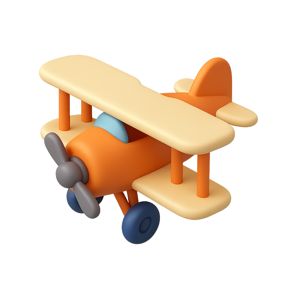 A vibrant 3D biplane icon featuring a blend of orange and yellow colors, designed in a three-quarter isometric view with a smooth, volumetric appearance. The propeller and wheels add to its playful charm.