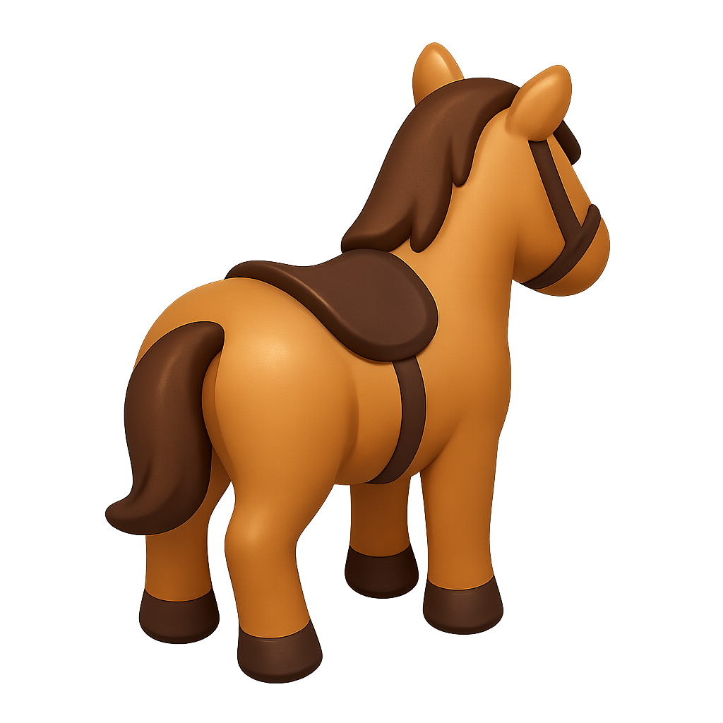 A cute, stylized 3D icon of a horse viewed from the back. The horse features a brown mane and saddle, showcasing a playful and cartoonish design.