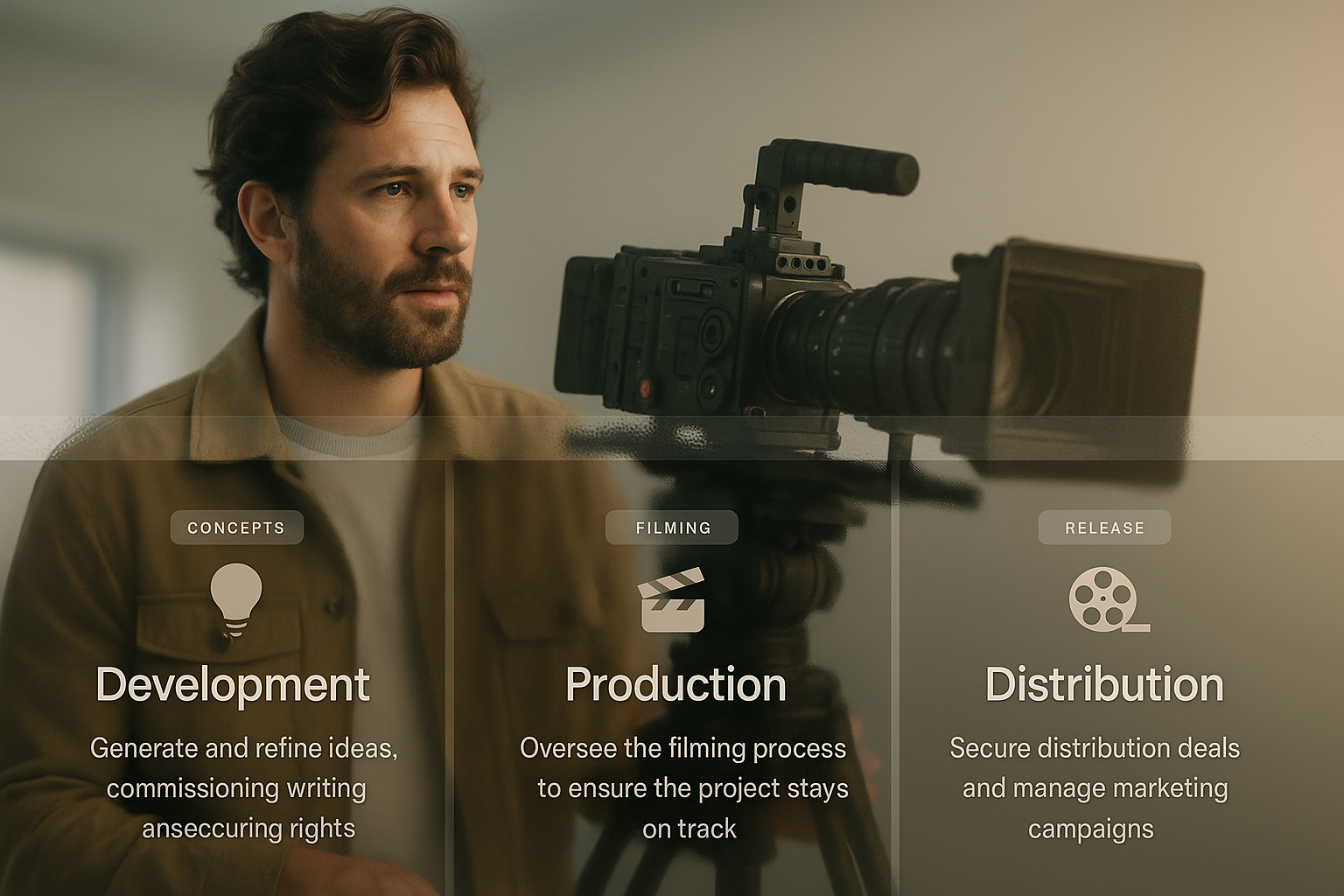 A stylish web page layout featuring three full-width blocks. Each block includes a title, icon, and text section, designed for a film producer's needs.