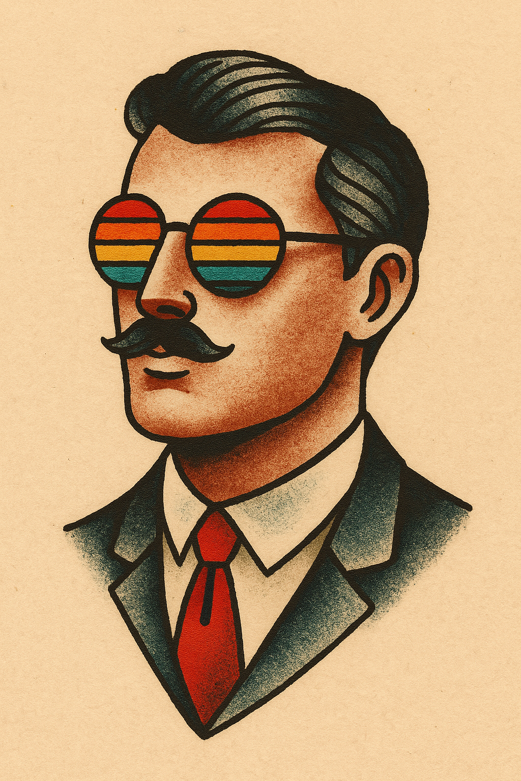 An illustration of a man with colorful glasses, symbolizing a distorted view of reality. The classic tattoo style features vibrant hues against a light beige background.