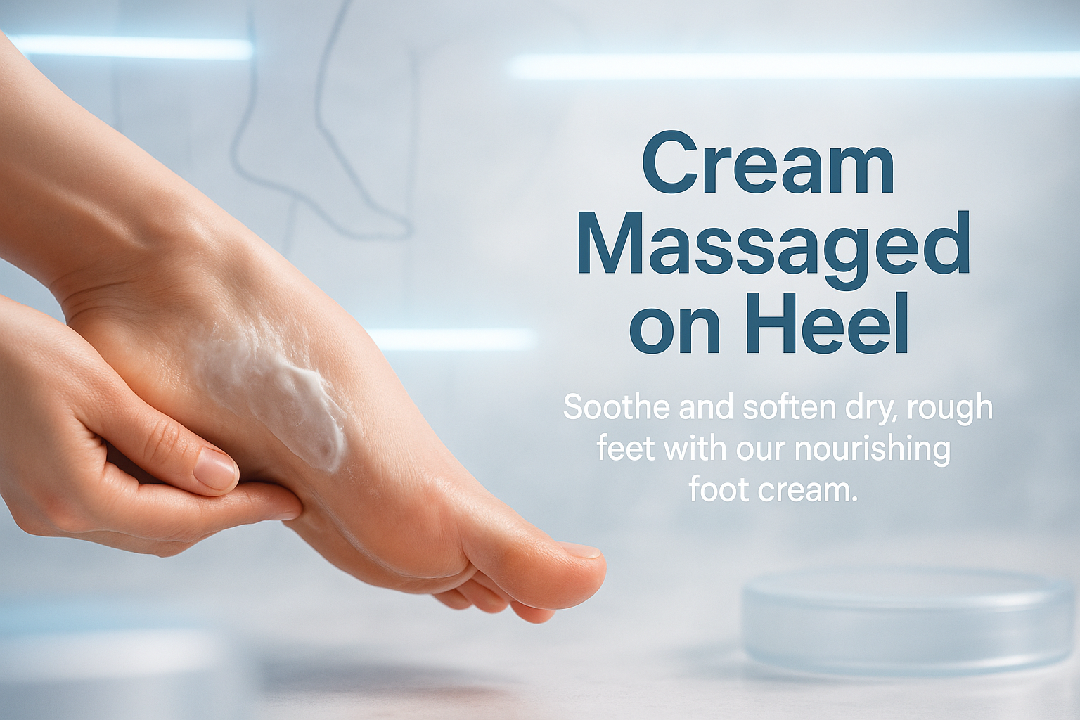 /Collection: /by davooda/Type: PNG/A visually engaging promotional image showcasing a hand applying cream to a foot's heel, emphasizing foot care. Ideal for skincare marketing and beauty product advertisements.
