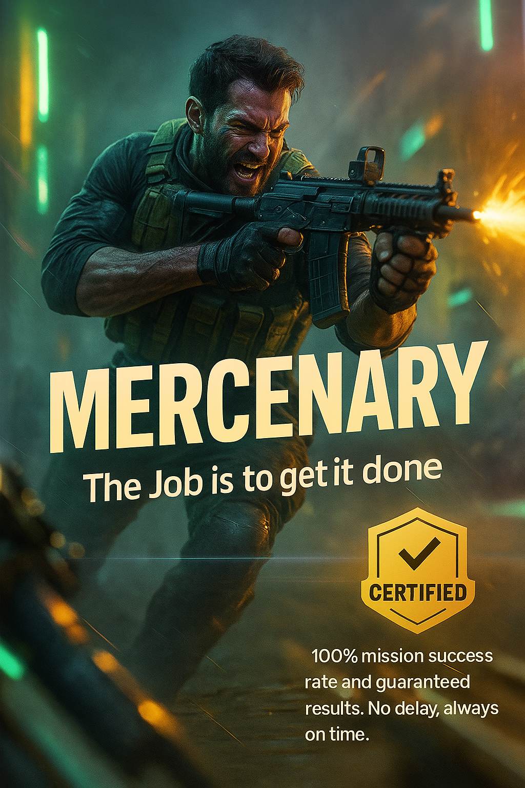 A dynamic advertisement featuring a mercenary in action with neon accents, showcasing the text 'Mercenary: The Job is to get it done' and a certified badge for credibility.