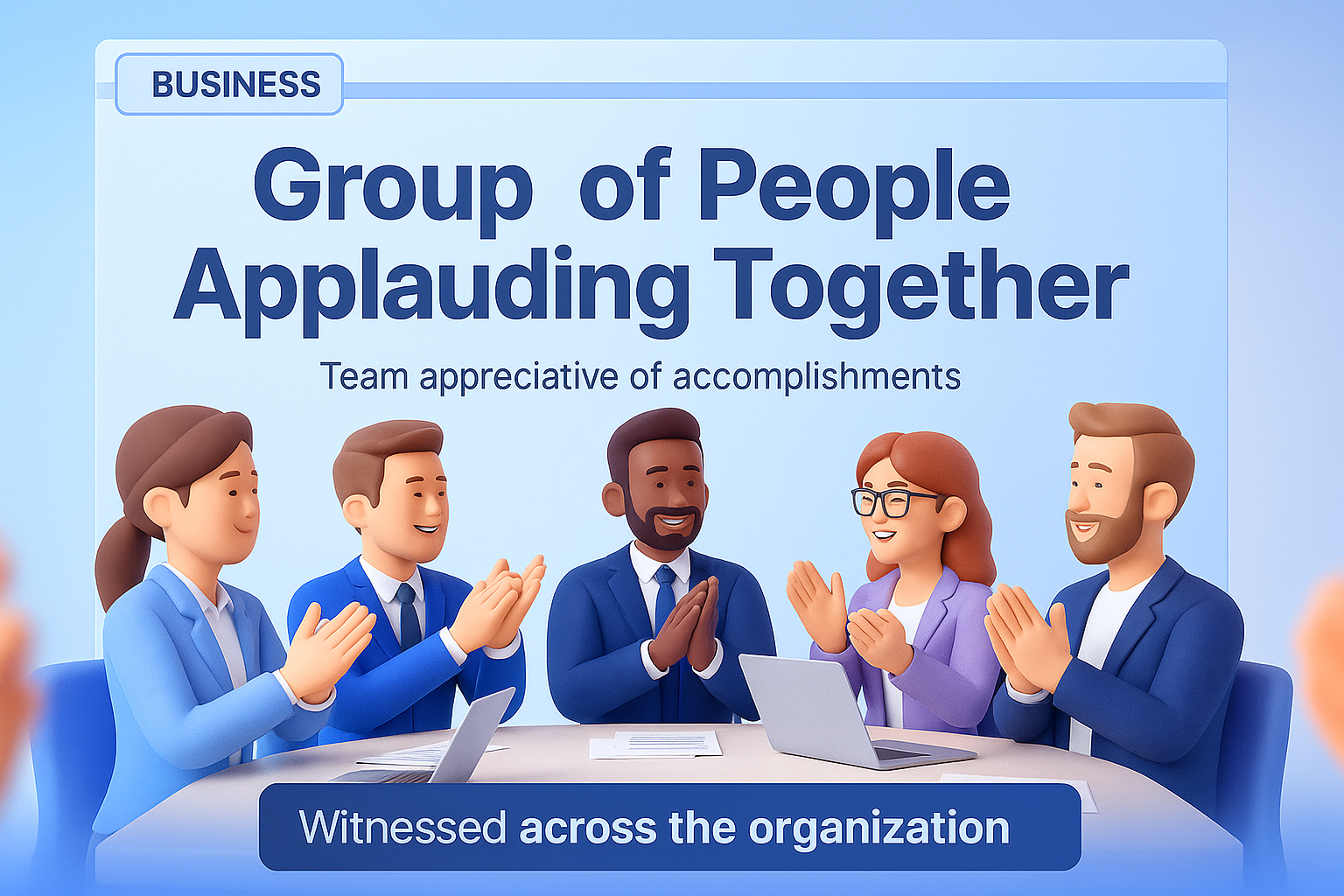 /Collection: /by davooda/Type: PNG/A 3D illustration depicting a group of diverse professionals applauding in a business meeting, celebrating achievements. The scene features a clean gradient background and clear, readable text elements.