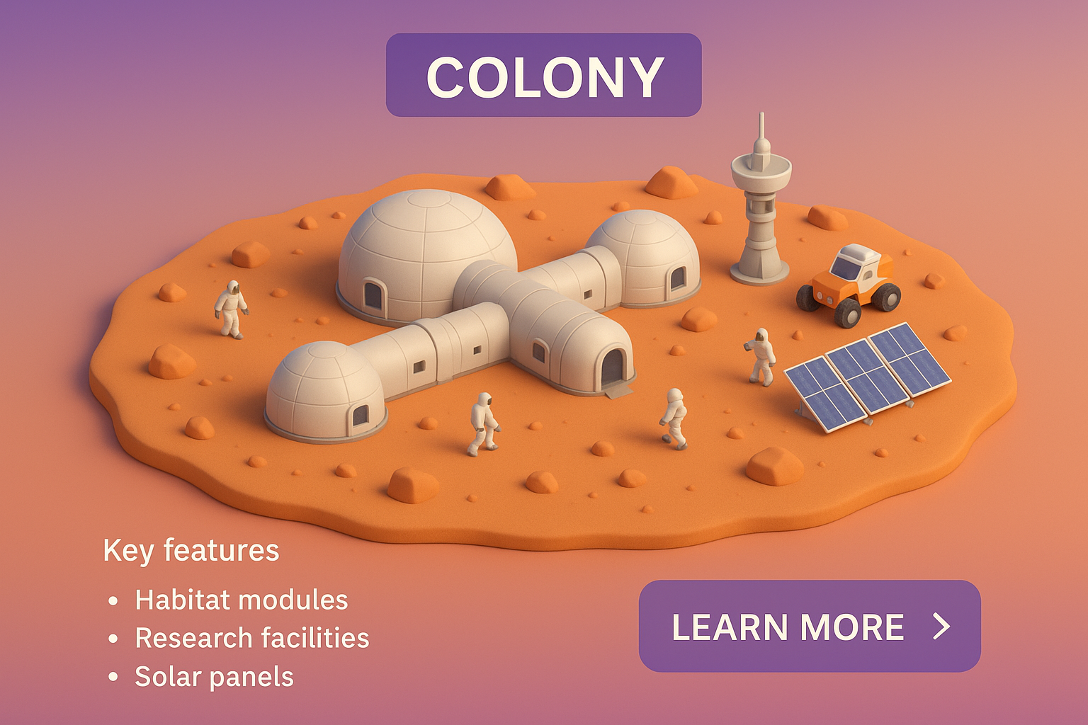 /Collection: /by davooda/Type: PNG/A zoomed-out 3D depiction of a futuristic colony on a vibrant landscape. Tiny figures engage with habitat modules, research facilities, and solar panels, showcasing a cohesive design.
